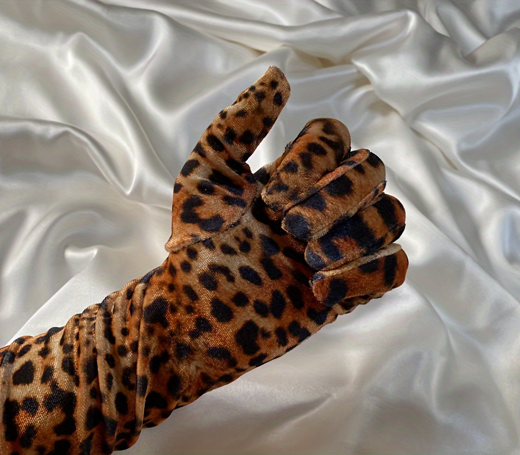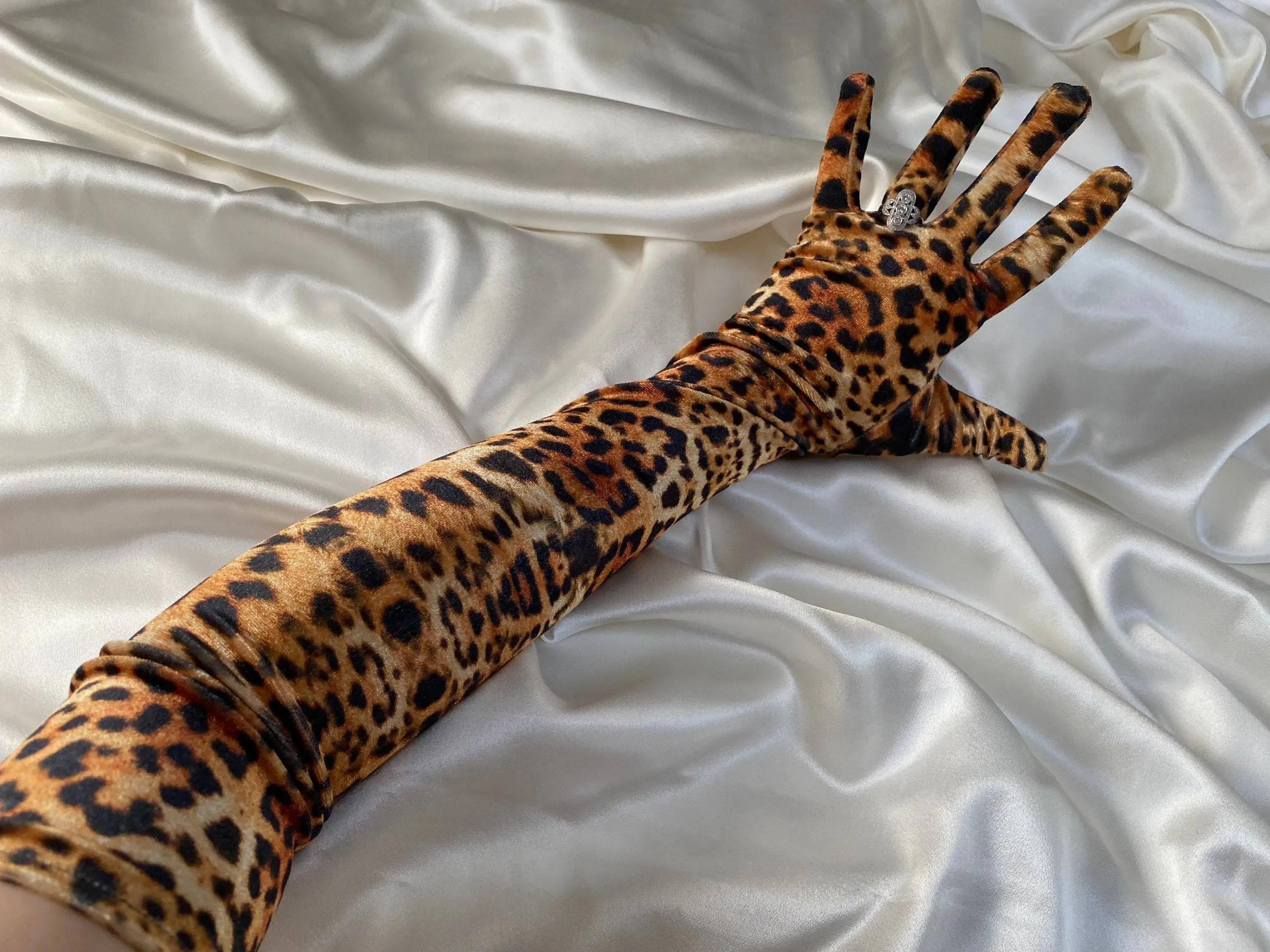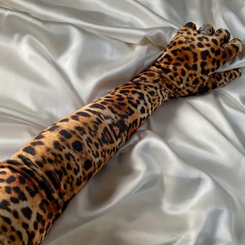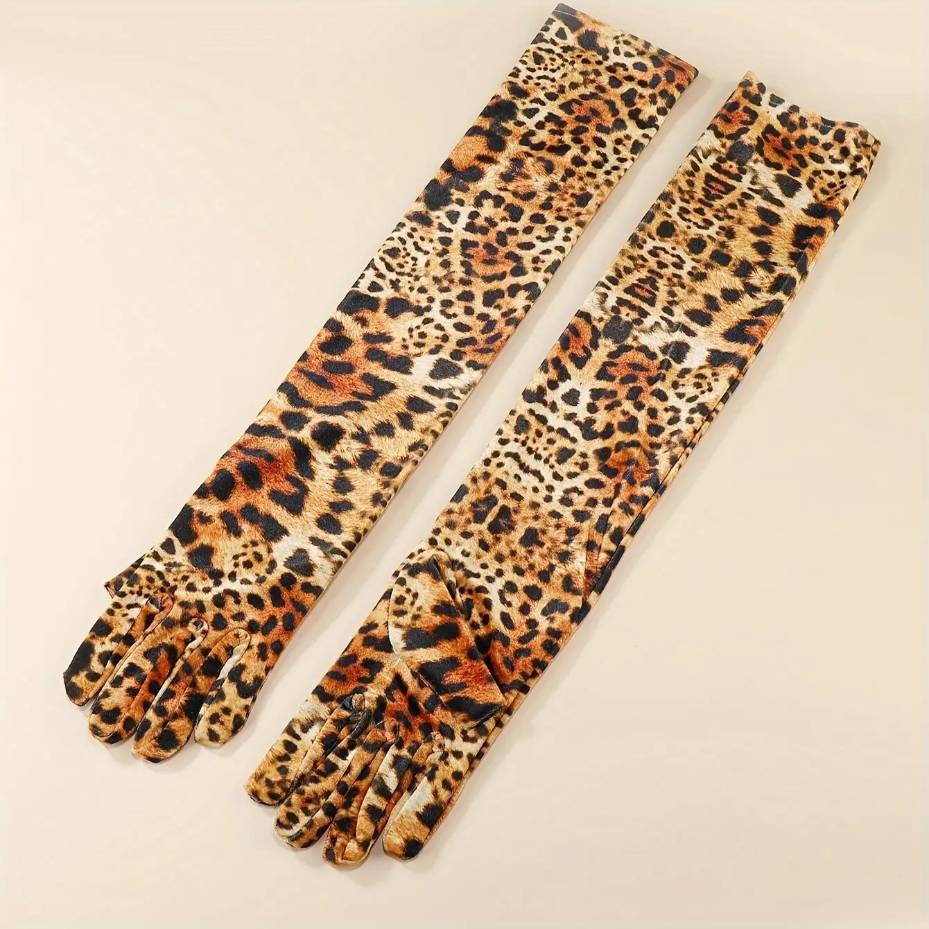 1 Pair YZNT Women'S Leopard Print Velvet Long Gloves - Stretchy Polyester, Machine Washable, Bold Animal Pattern for Parties, Performances & Evening Wear, Elegant Design with Black & Brown Leopard Print, Party Accessories, Pe