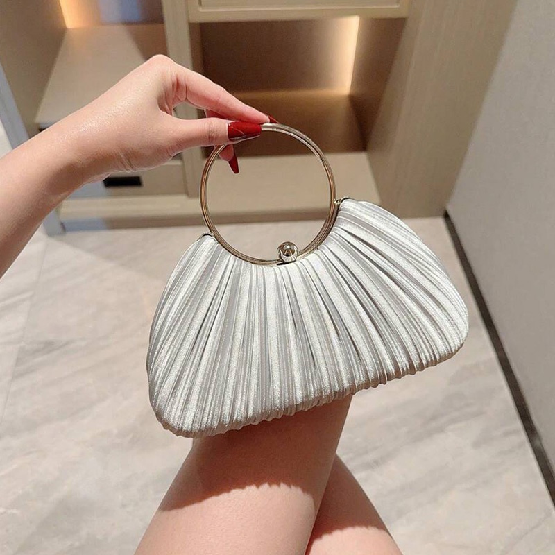 Elegant Satin Pleated Evening Clutch with Golden-Tone Ring Handle - Chic Round Shoulder Bag for Parties, Galas & Formal Events, Black, Party Accessory, Sophisticated Design, Smooth Texture Finish